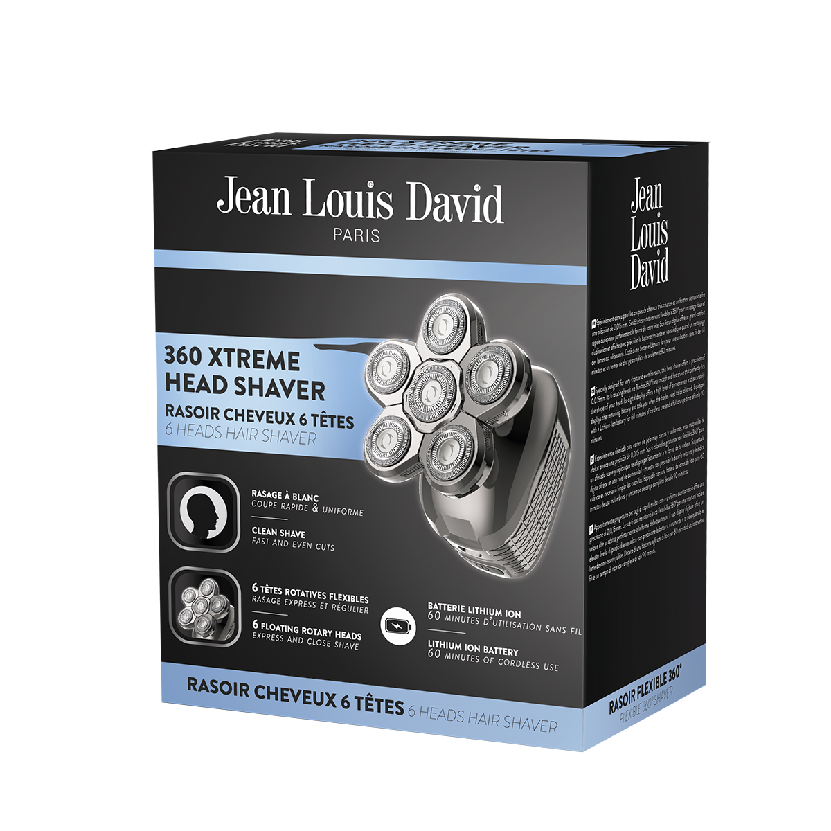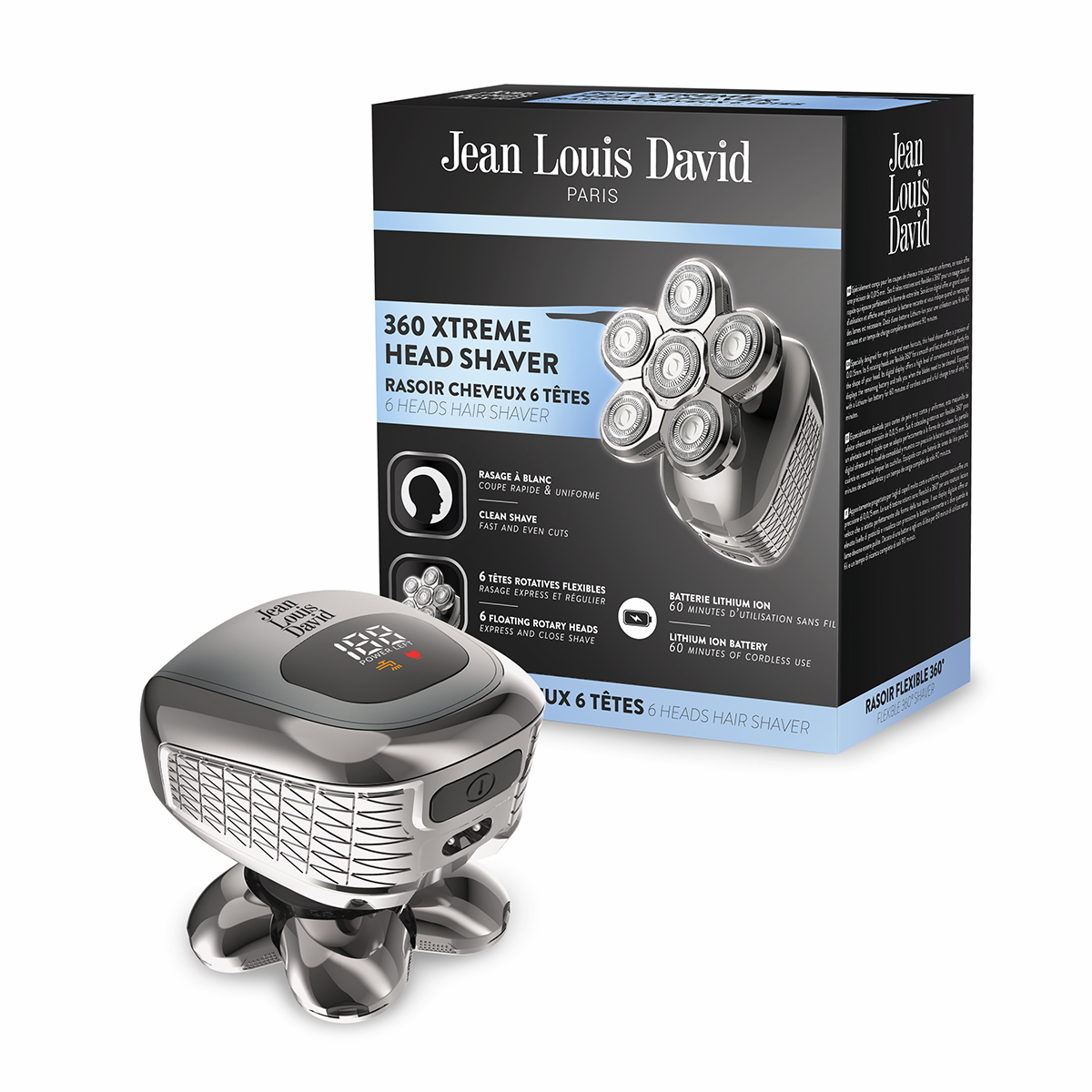Η επαναφορτιζόμενη/ρεύματος ξυριστική μηχανή 360 Xtreme της J.L.DAVID έρχεται με 6 εύκαμπτες περιστρεφόμενες κεφαλές 360° προσφέροντας άψογη εφαρμογή και γρήγορο, ομοιόμορφο αποτέλεσμα. Διαθέτει αδιάβροχη προστασία IPX6 (με τις κεφαλές να πλένονται σε τεχούμενο νερό βρύσης) , λειτουργεί τόσο σε βρεγμένο όσο και σε στεγνό δέρμα και είναι εξοπλισμένη με ψηφιακή οθόνη που εμφανίζει το ποσοστό της μπαταρίας και ειδοποιεί πότε οι λεπίδες χρειάζονται λίπανση. Με μήκος κοπής 0,015 mm, αυτονομία 60 λεπτών και χρόνο φόρτισης 90 λεπτών, προσφέρει αξιόπιστη απόδοση σε κάθε χρήση. Συνοδεύεται από πρακτικά αξεσουάρ, όπως βουρτσάκι καθαρισμού, λάδι λίπανσης και καλώδιο φόρτισης.