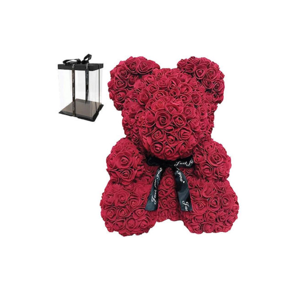 Αρκουδάκι από τεχνητά τριαντάφυλλα μπορντό 25cm σε κουτί