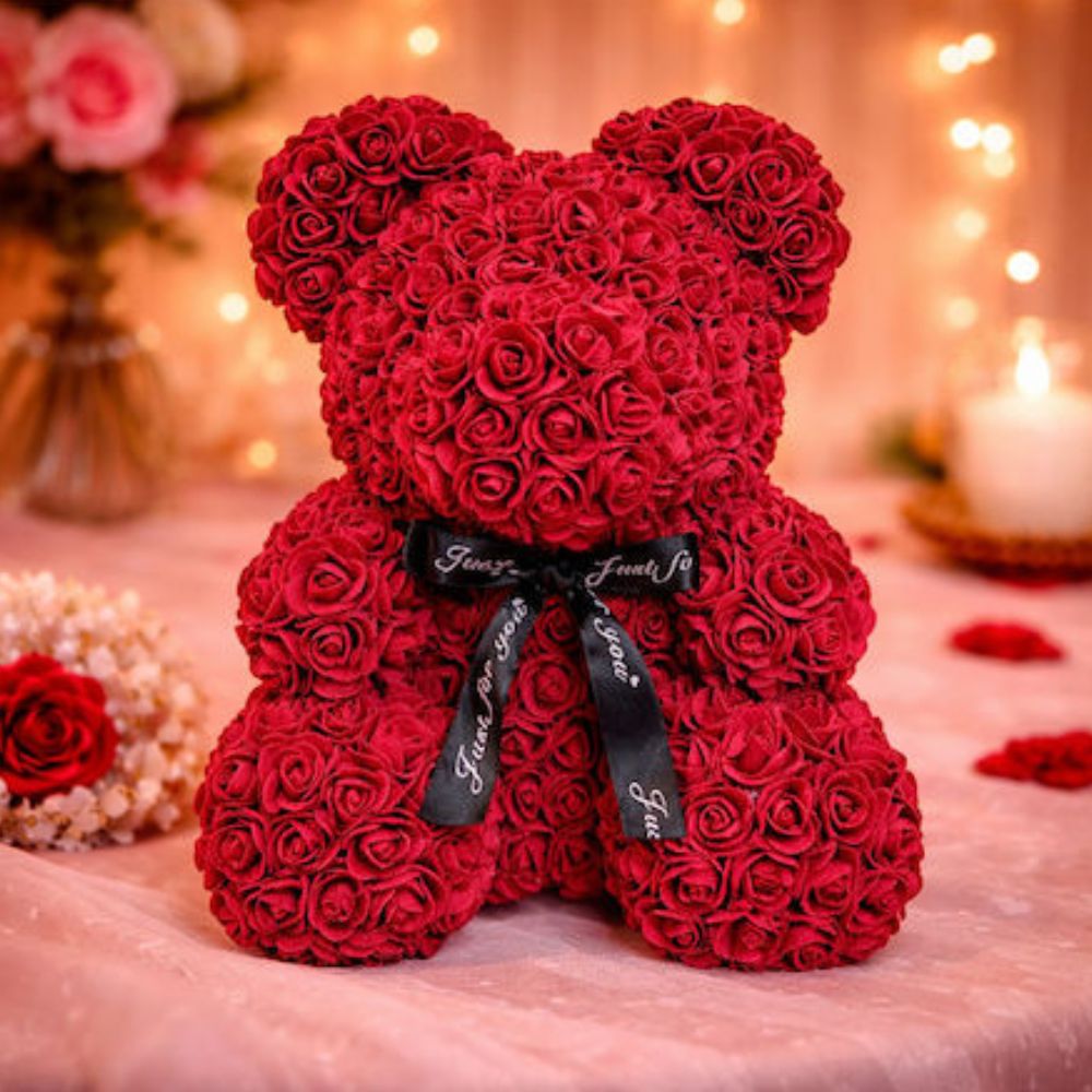 Το αρκουδάκ αυτό συνδυάζει την τρυφερότητα ενός αρκούδου με την κομψότητα των τεχνητών τριαντάφυλλων, δημιουργώντας μια όμορφη διακοσμητική πρόταση για κάθε χώρο.
