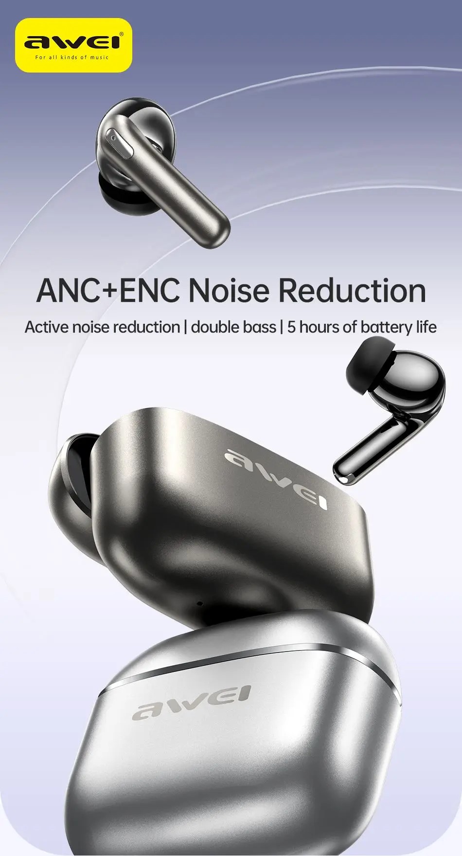 Τα ασύρματα ακουστικά Awei TA13 προσφέρουν μία σύγχρονη και ολοκληρωμένη εμπειρία ακρόασης, συνδυάζοντας προηγμένη τεχνολογία Bluetooth με ενεργή ακύρωση θορύβου για άνετη χρήση σε κάθε περιβάλλον.