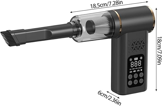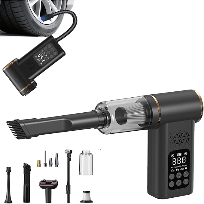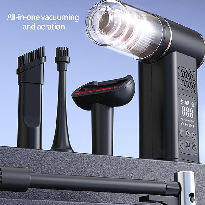 Η ασύρματη φορητή συσκευή 5 σε 1 συνδυάζει ηλεκτρική σκούπα χειρός, φουσκωτή ελαστικών, ψηφιακό μανόμετρο, φυσητήρα και φωτισμό LED σε μία συμπαγή μονάδα, προσφέροντας ολοκληρωμένη λύση για το αυτοκίνητο, το σπίτι και τις εξωτερικές δραστηριότητες.