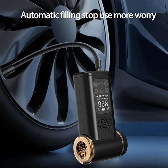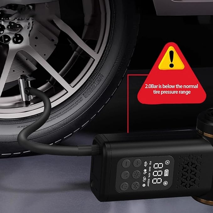 Ο ενσωματωμένος ψηφιακός συμπιεστής αέρα με οθόνη LCD εμφανίζει με ακρίβεια την πίεση σε πραγματικό χρόνο (0.2–10.5 bar / 3–150 psi) και υποστηρίζει λειτουργία αυτόματης διακοπής μόλις επιτευχθεί η προκαθορισμένη τιμή, αποτρέποντας το υπερβολικό φούσκωμα ελαστικών, μπαλών ή φουσκωτών.
