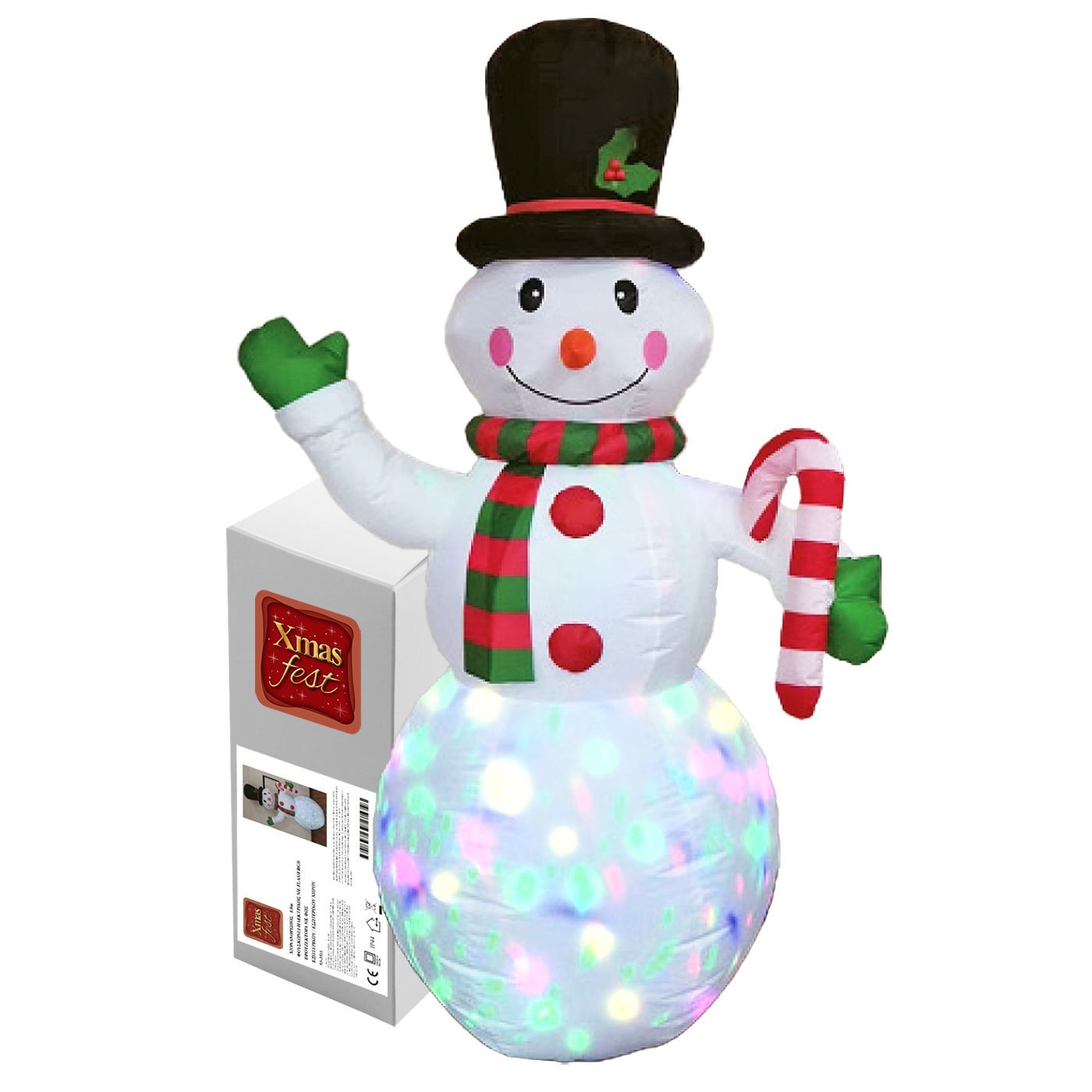 Φουσκωτός Χιονάνθρωπος ύψους 1,8m με φως και RGB flash προτζέκτορα. Αδιάβροχος IP44, με ηλεκτρικό φούσκωμα για άμεση εγκατάσταση σε εσωτερικούς & εξωτερικούς χώρους.