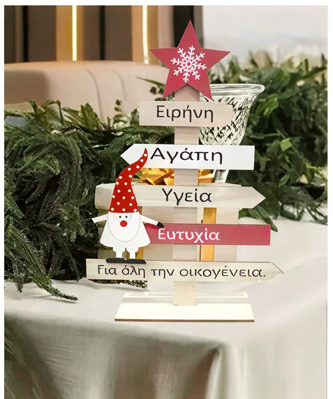 Το συγκεκριμένο διακοσμητικό σχηματίζει ένα χριστουγεννιάτικο δέντρο από πινακίδες με ελληνικές ευχές.