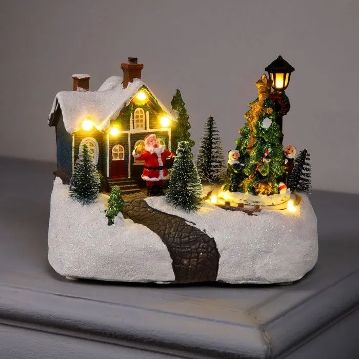 Διαθέτει σπιτάκι με φωτάκια, Άγιο Βασίλη στην είσοδο και χιονισμένο διάδρομο που οδηγεί σε ένα λαμπερό δέντρο.