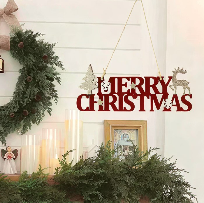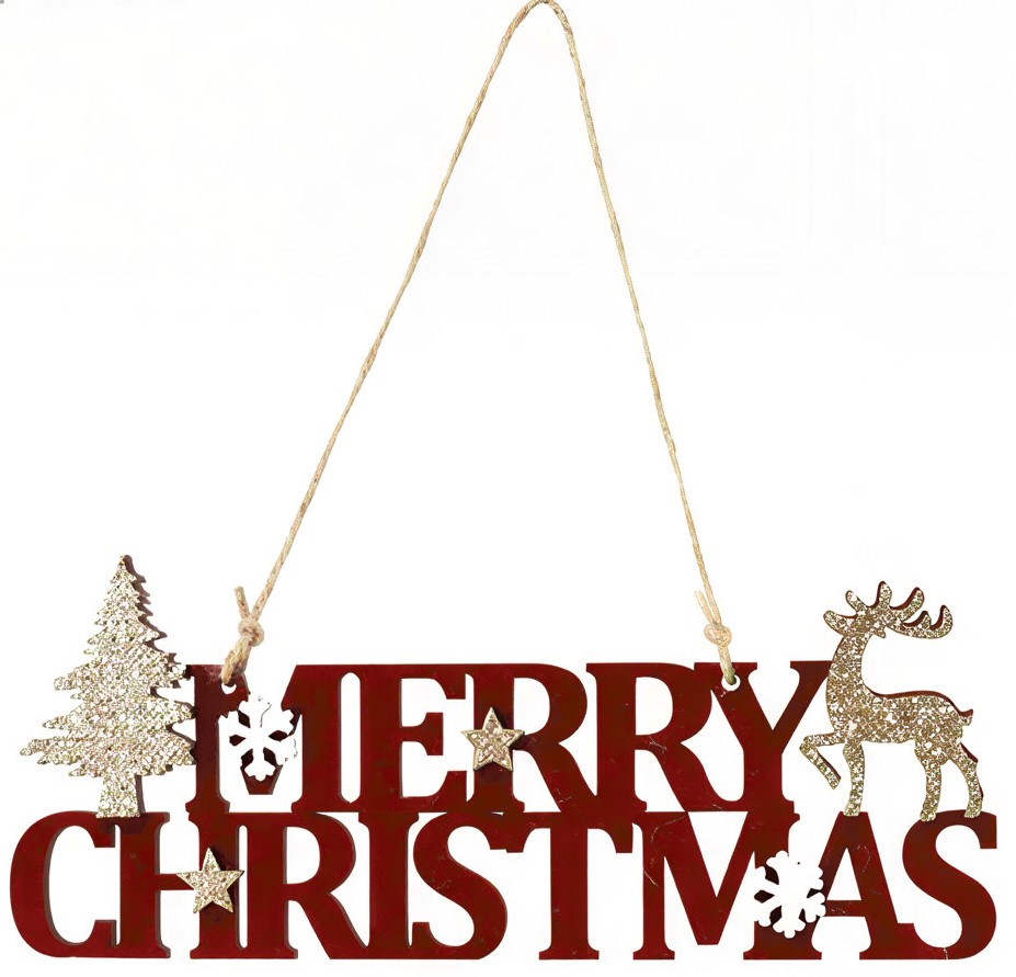 Αυτό το εντυπωσιακό ξύλινο κρεμαστό γράφει “Merry Christmas” και είναι διακοσμημένο με χρυσό δεντράκι και τάρανδο, δημιουργώντας μια γιορτινή και λαμπερή σύνθεση.