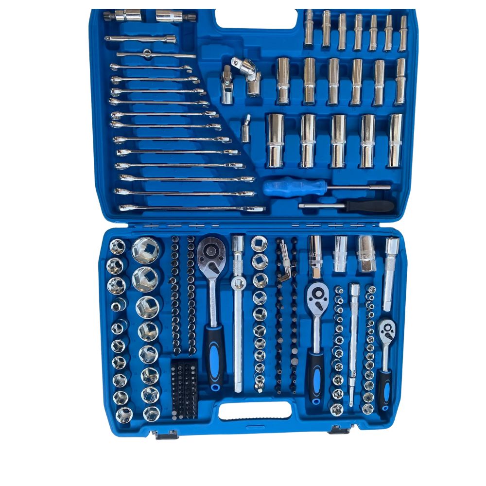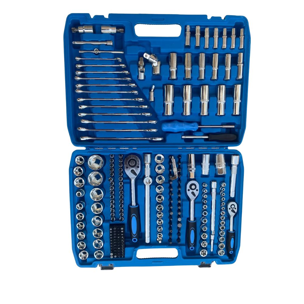 Ένα πλήρες σετ εργαλείων NEW TOOLS που περιλαμβάνει καρυδάκια, καστάνιες, κατσαβιδόμυτες και εξαρτήματα, όλα τακτοποιημένα σε ανθεκτική πλαστική θήκη. Ιδανικό για επαγγελματική και ερασιτεχνική χρήση, καλύπτοντας τις ανάγκες κάθε συνεργείου, μηχανικού ή μάστορα.