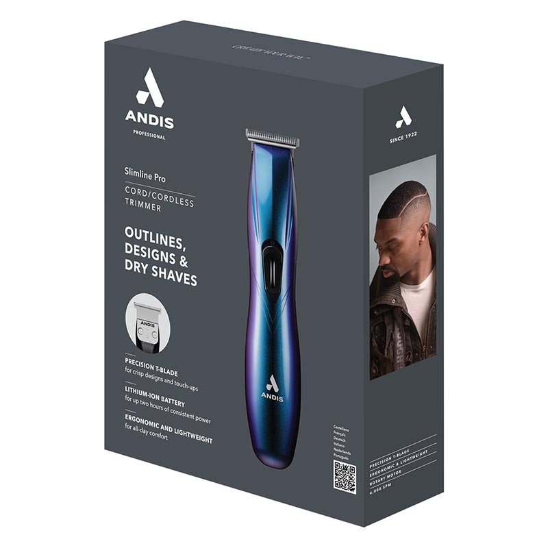 Το trimmer SLIMLINE PRO LI D-8 της ANDIS είναι εξοπλισμένο με ένα υψηλής ισχύος περιστροφικό μοτέρ που προσφέρει 6000 κινήσεις το λεπτό για μέγιστη απόδοση και ακρίβεια.  Το trimmer διαθέτει επαναφορτιζόμενη μπαταρία λιθίου με αυτονομία 120 λεπτών και διακόπτη on/off. Συνοδεύεται από 4 χτενάκια (1.5mm, 3mm, 6mm, 9mm) και 6 εναλλάξιμα βύσματα ρεύματος. Το ελαφρύ βάρος και οι συμπαγείς διαστάσεις το καθιστούν εύκολο στη χρήση και τη μεταφορά.