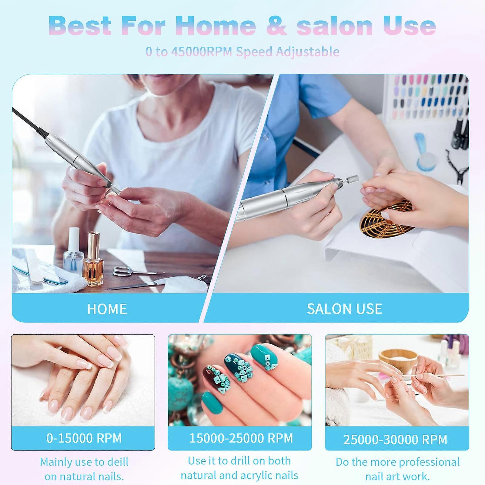 Διαθέτει ρυθμιζόμενη ταχύτητα έως 45.000 στροφές ανά λεπτό, προσφέροντας ακρίβεια σε εργασίες όπως αφαίρεση gel και ακρυλικού, λείανση φυσικών νυχιών, καθαρισμό επωνυχίων και λεπτομερή διαμόρφωση.
