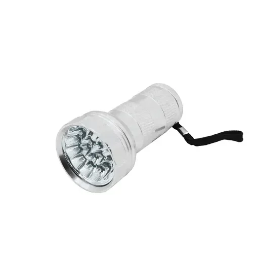 LED φακός με ψυχρό λευκό φωτισμό, σε ασημί χρώμα. Λειτουργεί με 3 μπαταρίες ΑΑ (δεν περιλαμβάνονται). Διαθέτει 17 LED SMD με ψυχρό λευκό φωτισμό. Είναι ελαφρύς, με εργονομικό σχεδιασμό και κορδονάκι, για εύκολο και άνετο κράτημα. Έχει στιβαρή κατασκευή από αλουμίνιο και είναι αρκετά ανθεκτικός στο νερό και στην σκόνη. Πρακτικός και ιδανικός για να τον έχετε μαζί σας παντού, χάρη στο μέγεθός του.