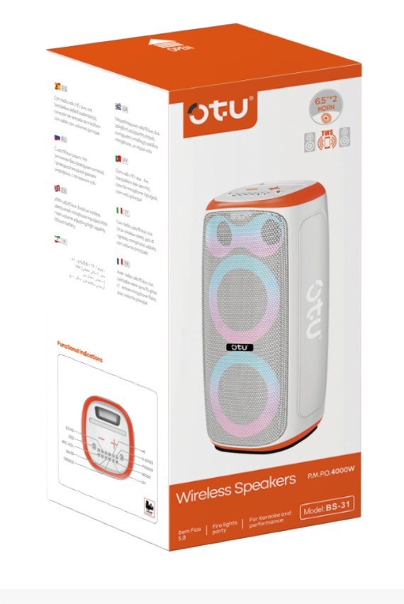 Το ασύρματο ηχείο Bluetooth OTU BS-31 είναι σχεδιασμένο για όσους θέλουν δυνατό ήχο και εντυπωσιακή εμφάνιση σε κάθε περίσταση, είτε πρόκειται για πάρτι στο σπίτι είτε για χρήση σε εξωτερικούς χώρους.