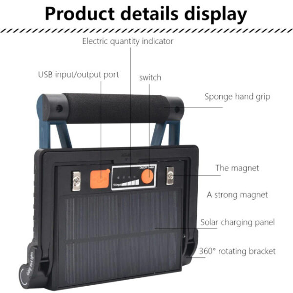 Ο φορητός ηλιακός προβολέας W875-1 είναι μια πρακτική και ισχυρή λύση φωτισμού, ιδανική για εξωτερικούς χώρους, κάμπινγκ, εργασία ή έκτακτες ανάγκες.