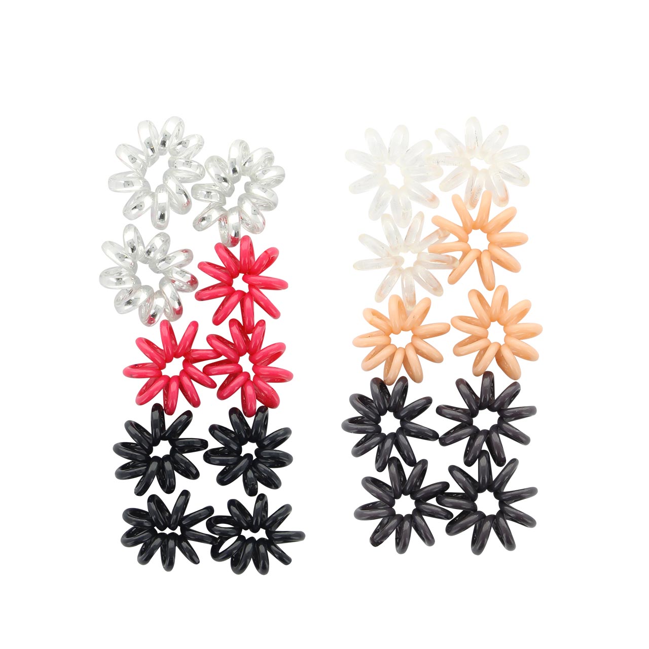 • 10 μίνι σπιράλ λαστιχάκια σε 2 διαθέσιμους συνδυασμούς χρωμάτων: μαύρα-λευκά-φούξια και γκρι/καφέ-διάφανα-σομόν.