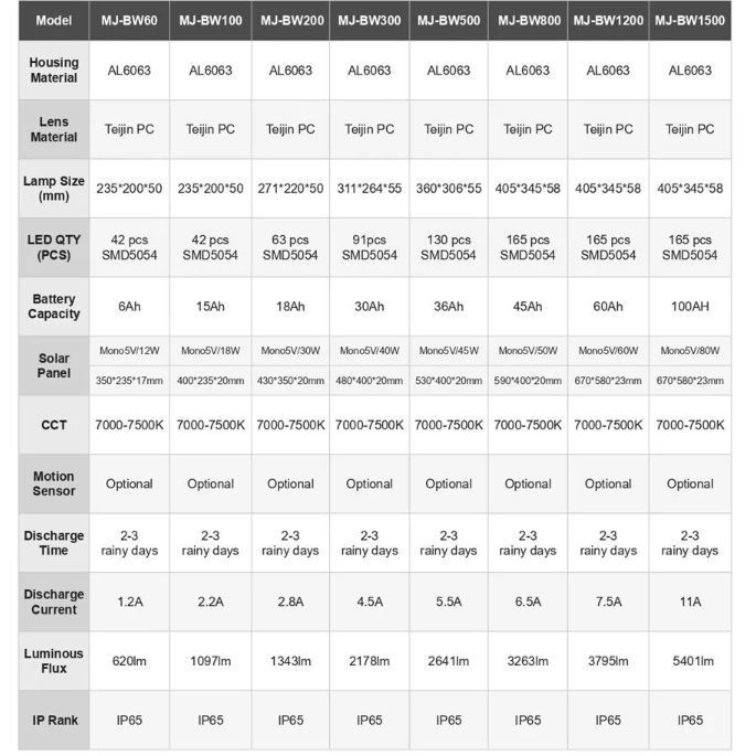 Ο MJ-BW1500 είναι ένας υψηλής απόδοσης ηλιακός LED προβολέας, σχεδιασμένος για μεγάλες εξωτερικές εγκαταστάσεις που απαιτούν ισχυρό, σταθερό και ομοιόμορφο φωτισμό. Με ισχύ 1500W και φωτεινότητα 5401 lumen, εξασφαλίζει άριστο φωτισμό για γήπεδα, πάρκινγκ, βιομηχανικούς χώρους, αποθήκες, αυλές και μεγάλα οικόπεδα.