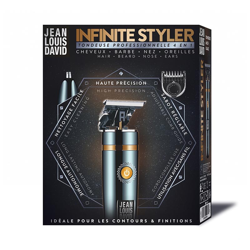 4 σε 1 τρίμερ ρεύματος – επαναφορτιζόμενο από την Jean Louis David! Είναι ιδανικό για το τριμάρισμα της γενειάδας και των μαλλιών, αλλά την δημιουργία επαγγελματικών looks με τεχνητές χωρίστρες, hair tattoos & contours αφού διαθέτει αποσπώμενη και πλενόμενη κεφαλή σε σχήμα «Τ». Επιπλέον προσφέρεται και για την περιποίηση λεπτομερειών σε μύτη και αυτιά, χάρη στην ειδική αποσπώμενη περιστροφική κεφαλή που συμπληρώνει το σετ. Τέλος, με μεγάλη αυτονομία μίας ώρας, χαμηλό μήκος κοπής και ειδικό χτενάκι-οδηγό 10 μικρορυθμίσεων υπόσχεται γρήγορο επαγγελματικό styling, ενώ εγγυάται και την εύκολη δημιουργία περίπλοκων πολυεπίπεδων στυλ σε μούσι, μουστάκι και μαλλιά.
