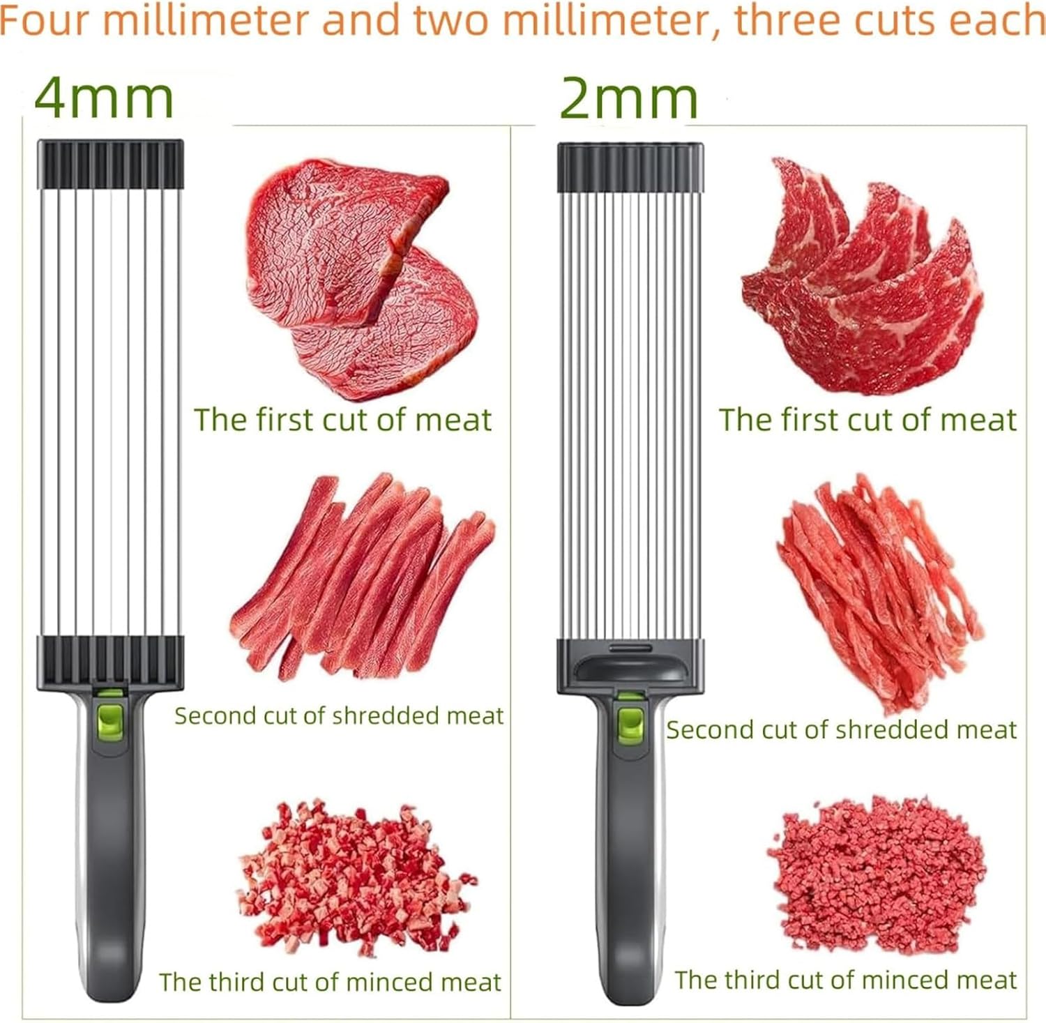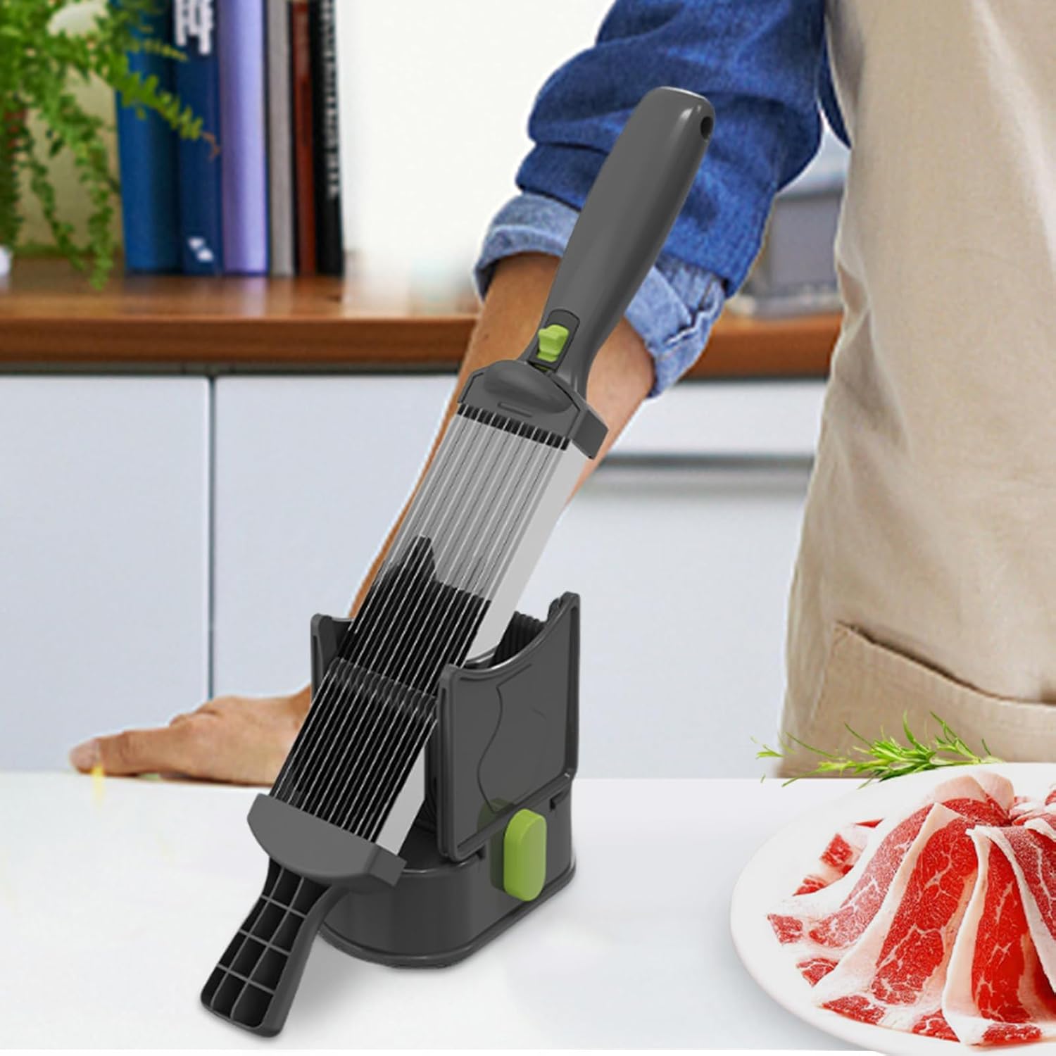 Διαθέτει πολλαπλές ανοξείδωτες λεπίδες υψηλής ποιότητας που παραμένουν αιχμηρές με τη χρήση και επιτρέπουν το γρήγορο κόψιμο φρέσκου κρέατος σε λωρίδες ή κομμάτια, διατηρώντας την υφή και την ποιότητα του τροφίμου.