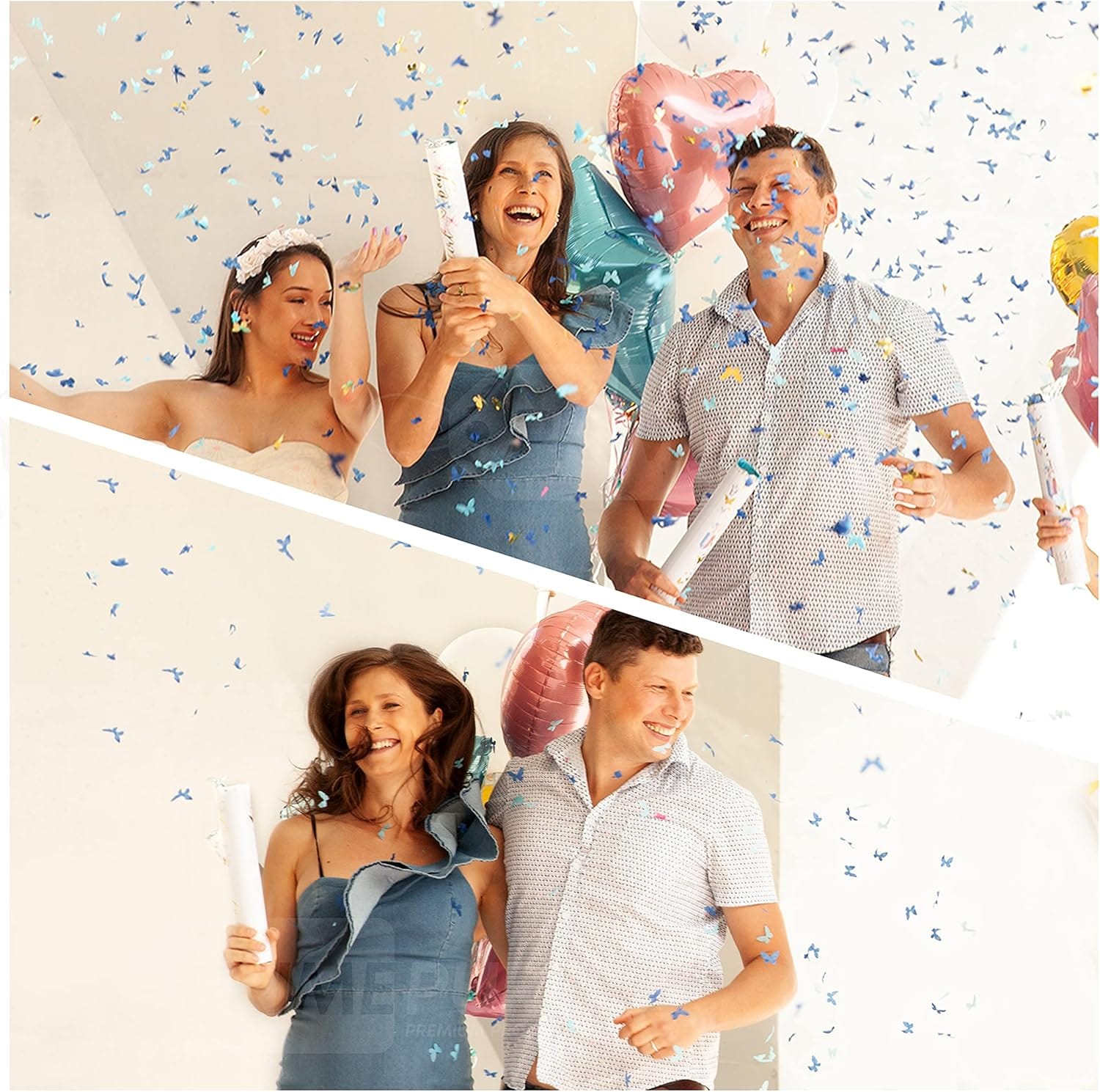 Με κομψά σχέδια πεταλούδας σε μπλε αποχρώσεις, αυτό το κομφετί δημιουργεί έναν υπέροχο τρόπο αποκάλυψης για την πιο ξεχωριστή στιγμή.