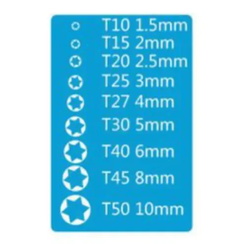 9 κλειδιά torx από ατσάλι Chrome vanadium (CR-V) με γυαλιστερό φινίρισμα μεγέθους: T10 1.mm, T15 2mm, T20 2.5mm, T25 3mm, T27 4mm, T30 5mm, T40 6mm, T45 8mm, T50 10mm