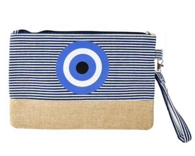 Αυτό το ριγέ νεσεσέρ με μπλε μάτι είναι ιδανικό για να αποθηκεύετε τα καθημερινά σας αντικείμενα με στυλ και ασφάλεια.