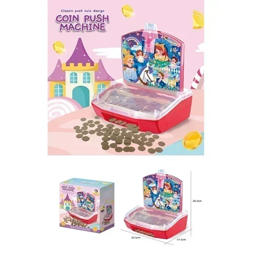 Το Coin Push Machine διαθέτει τον παραδοσιακό σχεδιασμό με μια κινούμενη πλατφόρμα γεμάτη με κέρματα, προσφέροντας μια αυθεντική εμπειρία παιχνιδιού.
