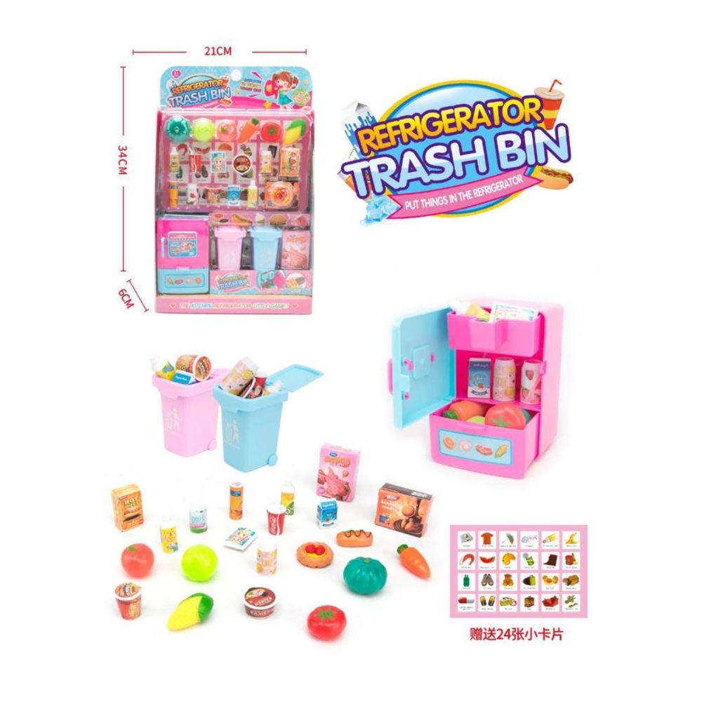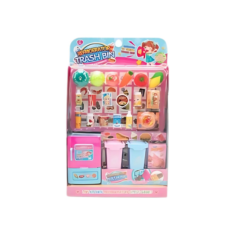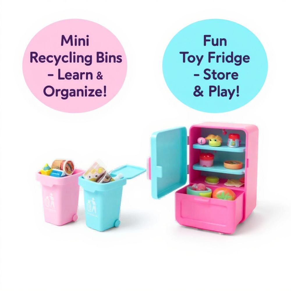 Ιδανικό για παιχνίδι ρόλων και πρώιμη μάθηση. Το σετ περιλαμβάνει ένα μίνι ψυγείο-παιχνίδι με ράφια και συρτάρια, δύο κάδους ανακύκλωσης (ροζ και γαλάζιο), καθώς και μια μεγάλη ποικιλία από μίνι τρόφιμα και προϊόντα όπως φρούτα, λαχανικά, ροφήματα και σνακ.