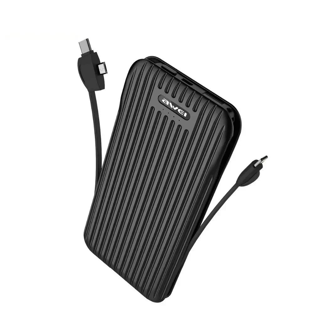 Power Bank Awei P80K 10000mAh, σε μαύρο χρώμα Power bank με είσοδο Micro, έξοδο USB και ενσωματωμένα καλώδια Τype C, Lightning και micro USB.