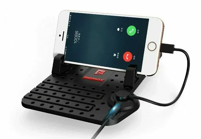 Βάση κινητού αυτοκινήτου της εταιρείας Remax. Η βάση στηρίζεται στο ταμπλό του αυτοκινήτου. Η στήριξη της συσκεύης στη βάση γίνεται με αντιολισθητική επιφάνεια.