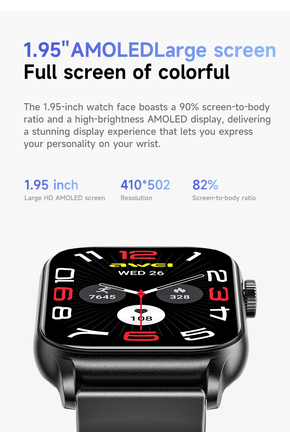 Διαθέτει μεγάλη οθόνη AMOLED 1.95 ιντσών που προσφέρει ζωντανά χρώματα και υψηλή ευκρίνεια, επιτρέποντας εύκολη ανάγνωση ειδοποιήσεων, μηνυμάτων και δεδομένων ακόμη και κάτω από έντονο φωτισμό.