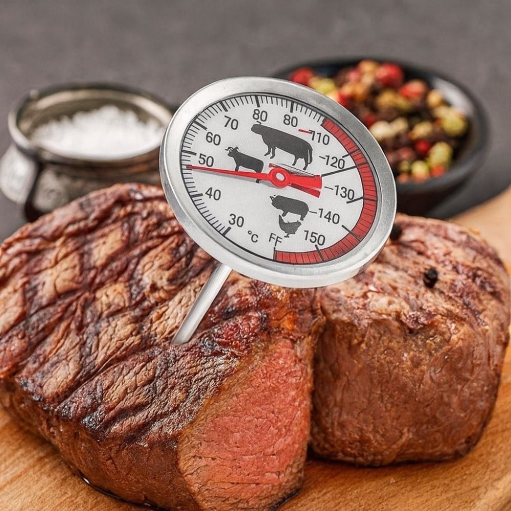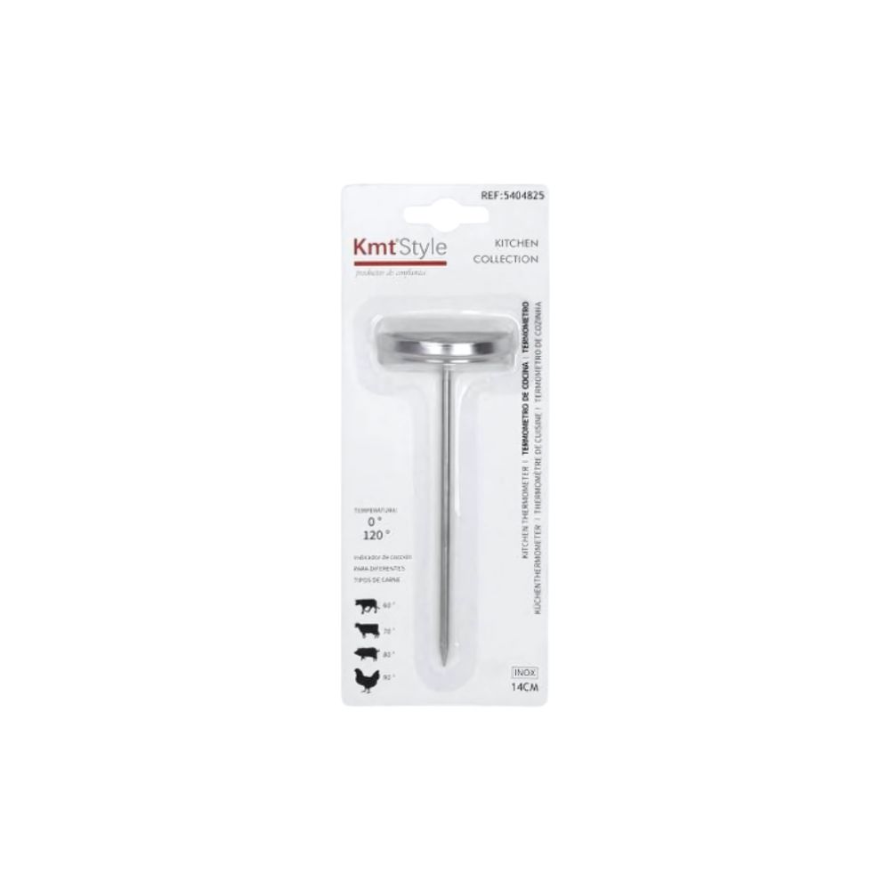 Θερμόμετρο Φαγητού Αναλογικό 14cm: Έχει μεταλλική κεφαλή με ακίδα, κατάλληλη για να μετράει τη θερμοκρασία του κρέατος. Με εύρος θερμοκρασίας από 0 έως 120°C, είναι εύκολο στη χρήση, χωρίς βιδωτά καλώδια ή μπαταρίες.