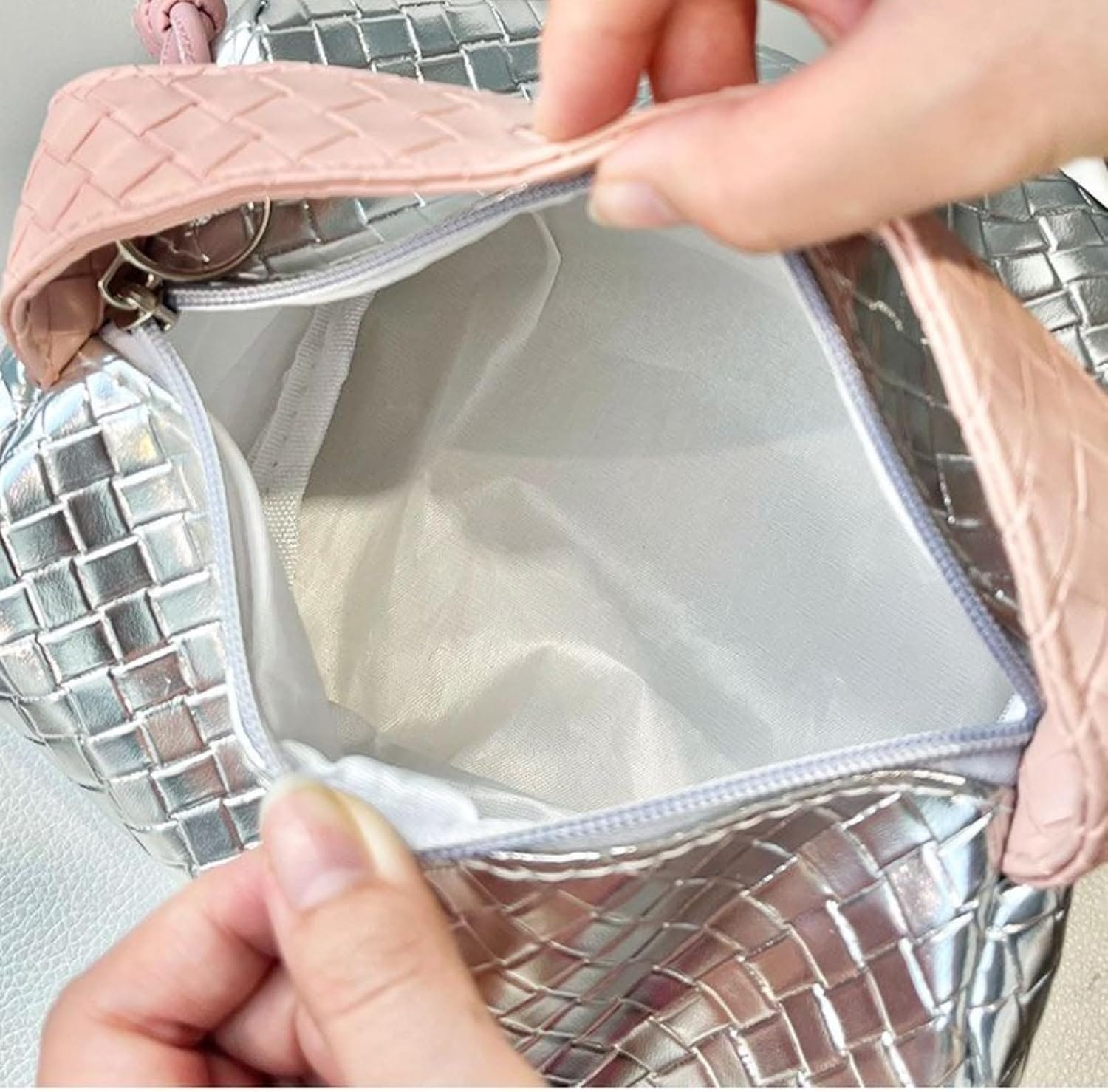 Η καλλυντική αυτή τσάντα διαθέτει κομψό και μοντέρνο σχεδιασμό με υφή που θυμίζει πλεκτό μοτίβο και λεπτομέρειες από ανθεκτική PU δερματίνη.