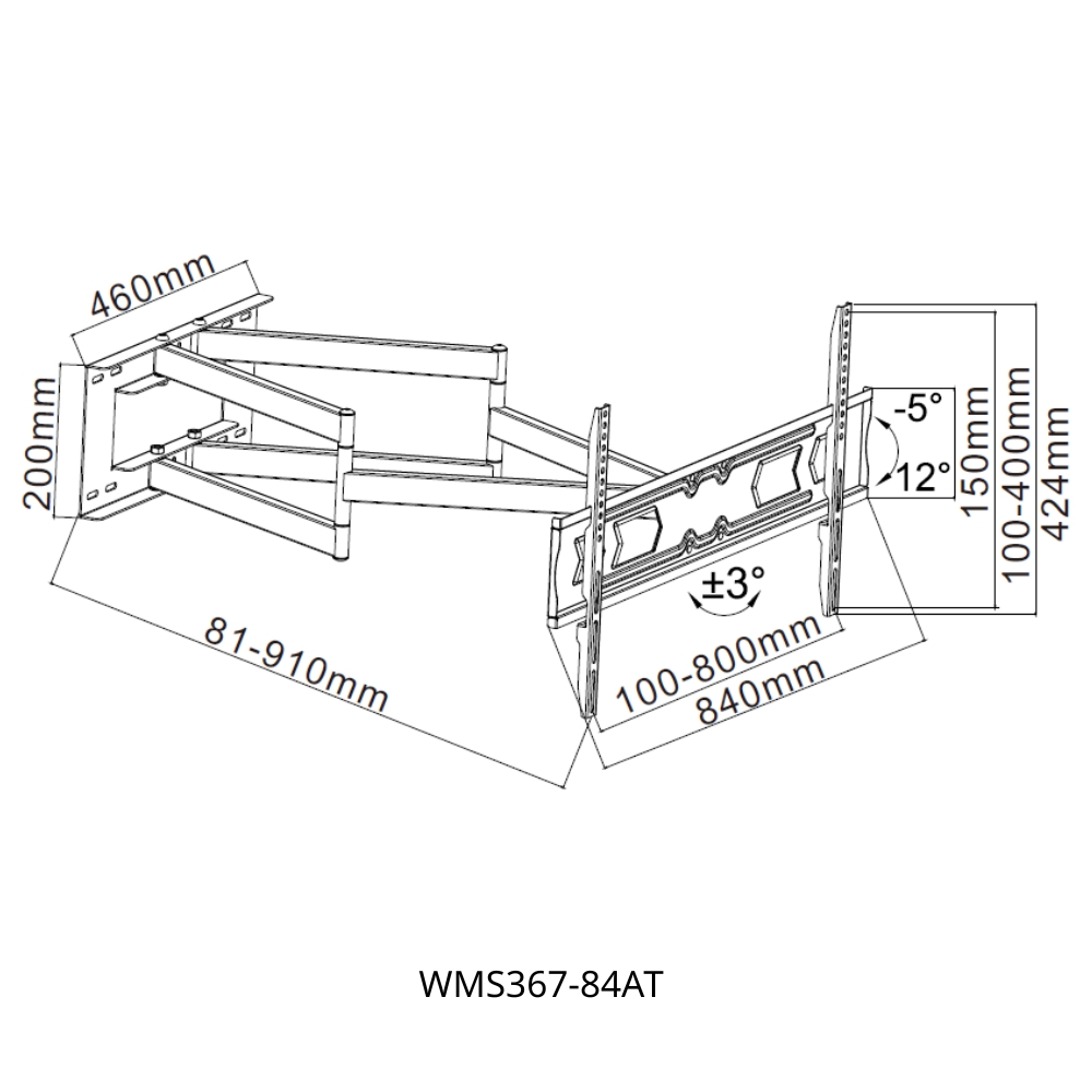 ΜοντέλοWMS367-84ATΧρώμαΜαύροVESA800x400Εγγύηση2 ΈτηΥποστηριζόμενο Μέγεθος Οθόνης42”-90”Τύπος ΒάσηςΔιπλού ΒραχίοναΑπόσταση από Τοίχο81-910mmΜέγιστo Βάρος σε kg70Εύρος Οριζόντιας Κλίσης-5°/+12°Διαστάσεις Προϊόντος σε mm910x200x460